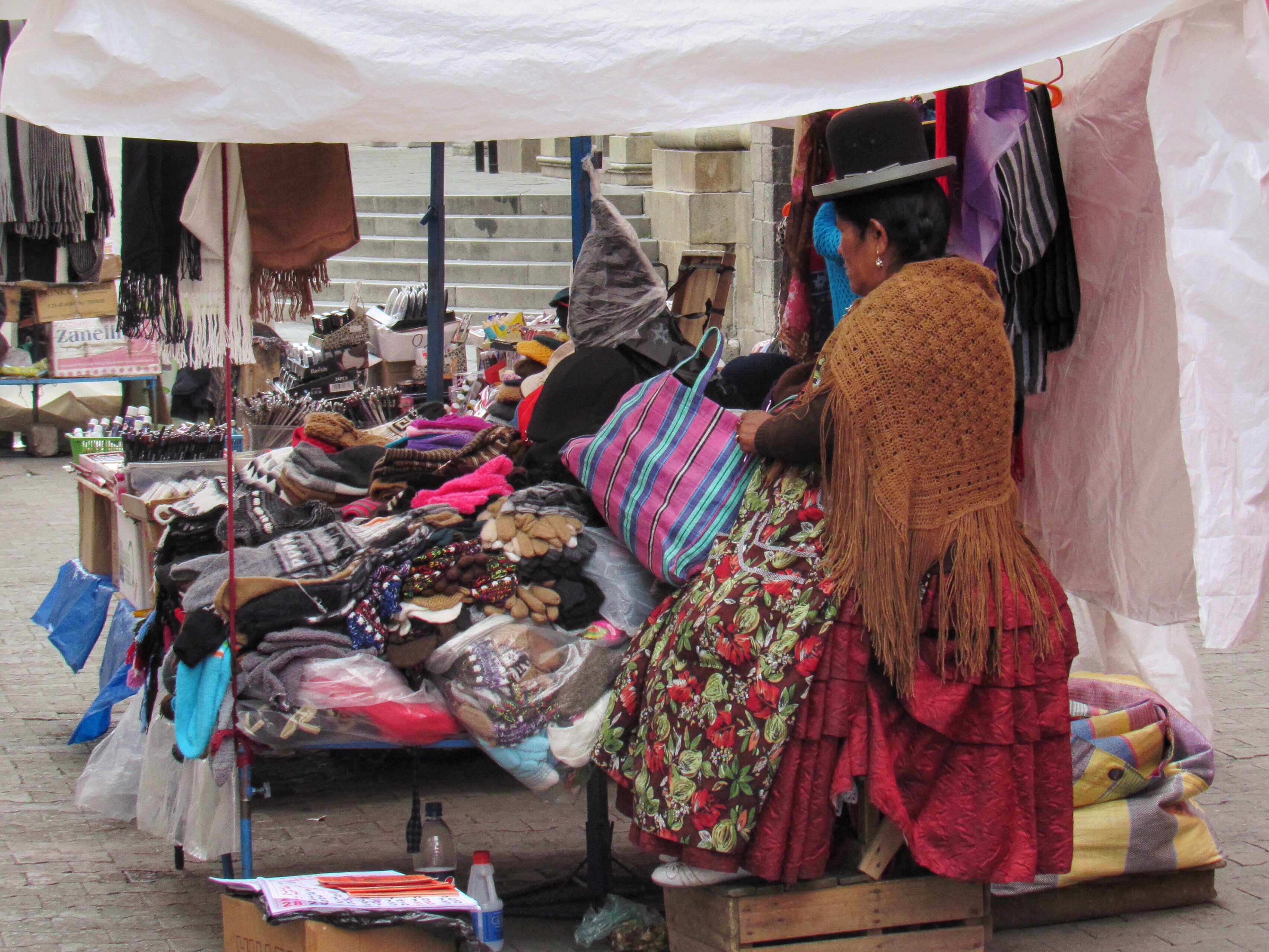 What makes La Paz beautiful and so interesting, apart from the surrounding mountains and the steep streets, is the colourfulness of the markets and the many people in traditional dress. It’s mostly the older women who still wear the distnctive Bolivian costume of bowler hats, shawls, silky blouses and bright skirts with bustles. This style only dates from the 16th century. Before that the indigenous peoples wore much more practical outfits. Apparently the Spanish christian missionaries decreed that the locals had to adopt the European style of dress of the times – hence the stylish but totally impractical bustles and bowler hats.