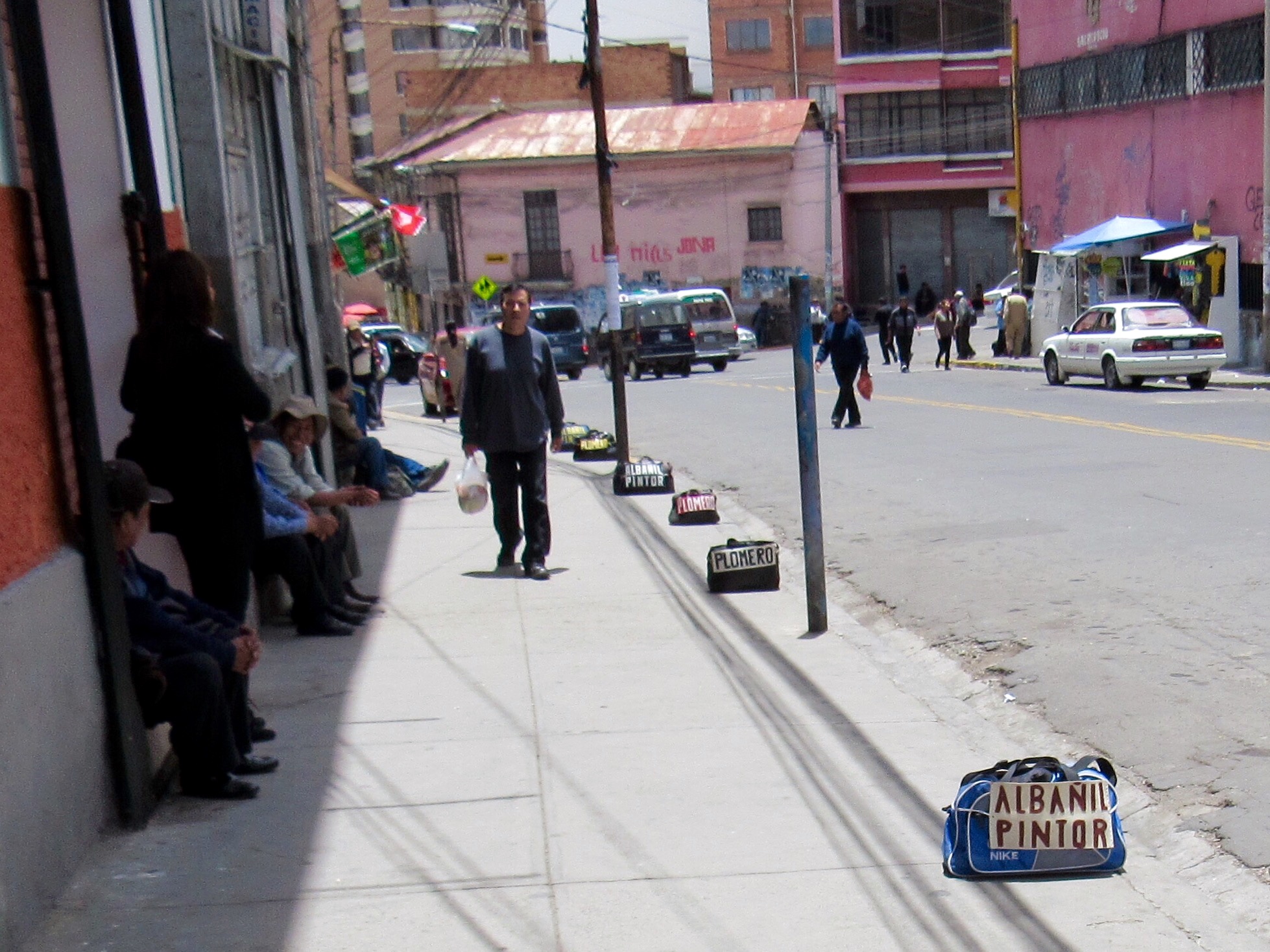 All along the streets you see little bags of tools with the name of a trade written on them – plumber, electrician, painter, carpenter. It’s a kind of ‘Tradie’s market’ where they put their bags out and sit and wait until someone comes along with a job for them.