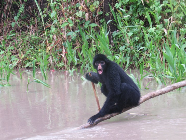 While travelling along the river in one of the groovy wooden boats we saw a big group of monkeys in the trees. When they saw the boat some tried to come and get in. A baby Capuchin monkey jumped in and clung to JH and I. It didn’t want to let go and screamed like a human baby when it was forced to. When I asked our guide about the strange behaviour from the monkeys, he said that its actually a monkey reserve and lots of the monkeys are rescue ones so they are accustomed to people and are hoping for bananas.